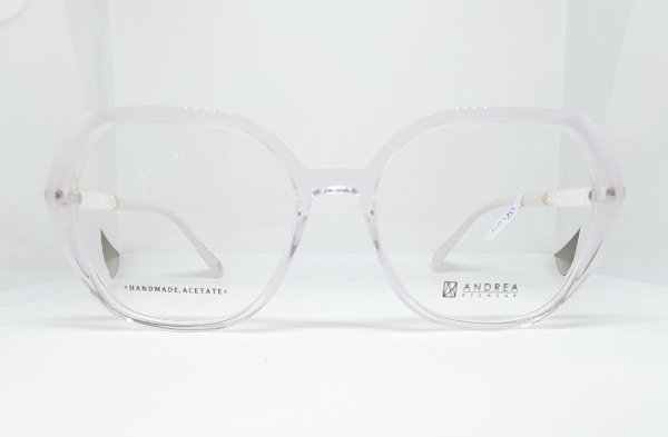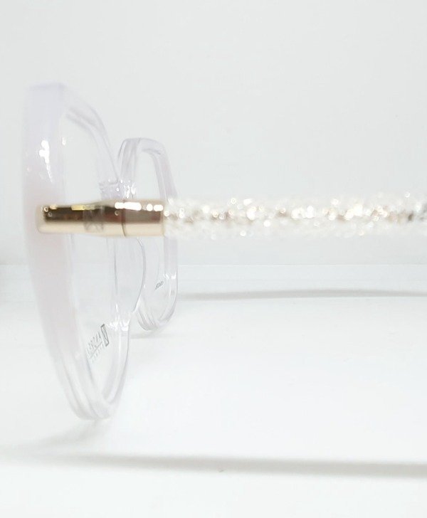 Armazón de acetato Andrea hexagonal cristal con detales blanco. Patillas brillo