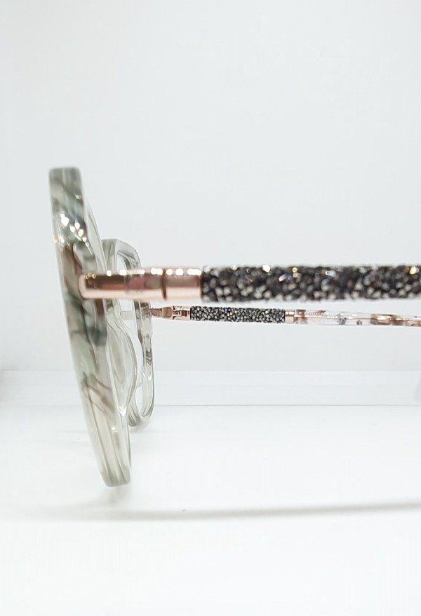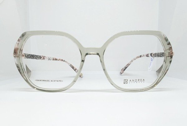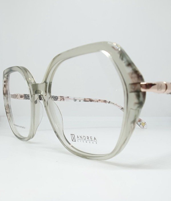 Armazón de acetato Andrea hexagonal gris con detales beige. Patillas brillo