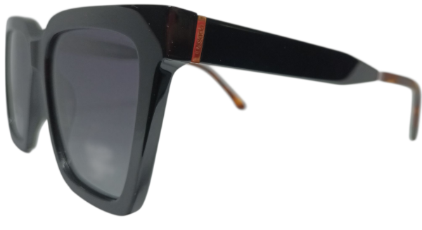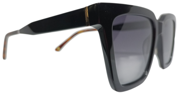 Armazón de acetato formato cuadrado, de negro brillante, patillas de color negro con terminales en color carey.