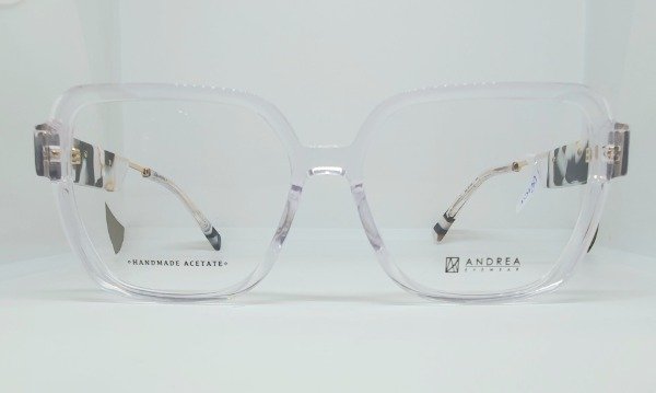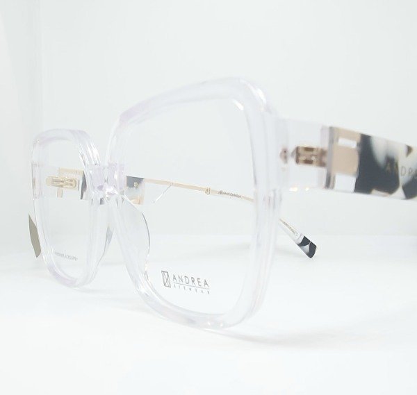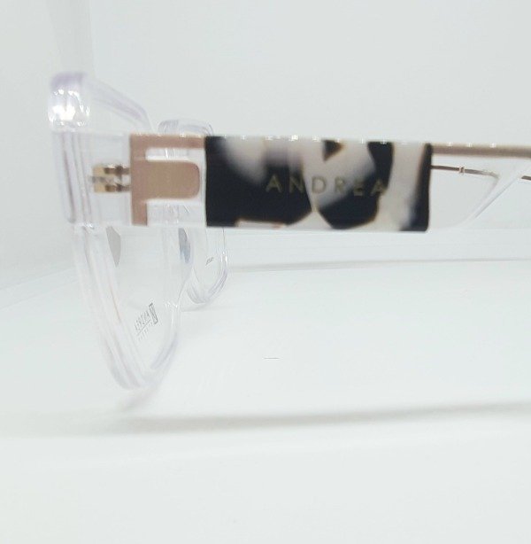 Armazón de acetato Andrea cuadrado transparente con detales blanco y negro. Patillas metal dorado