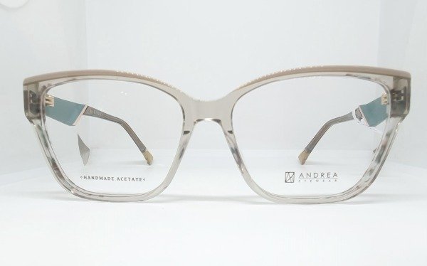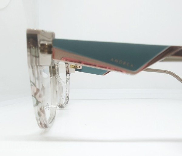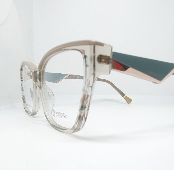 Armazón de acetato Andrea cuadrado gris con detales beige y verde seco. Patillas metal