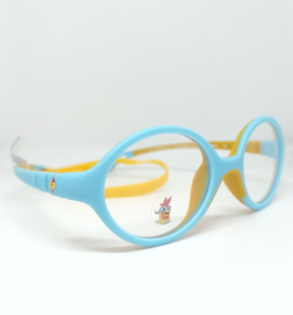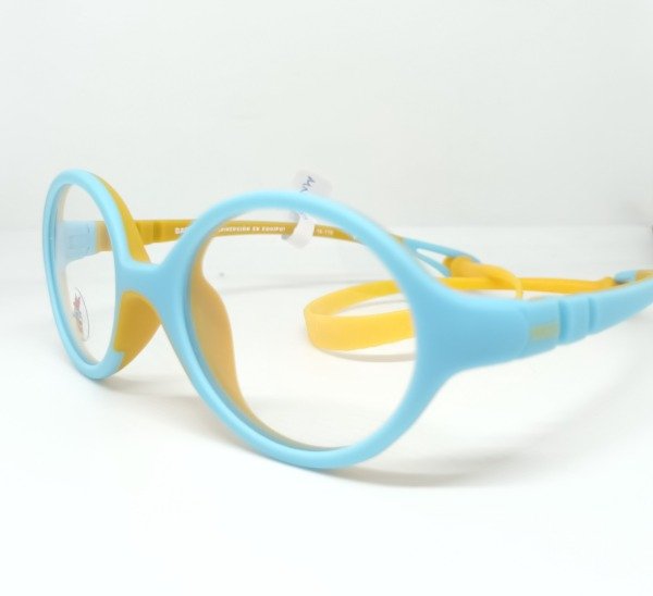 Material en tr90 liviano, formato redondo chico, color celeste y naranja.
